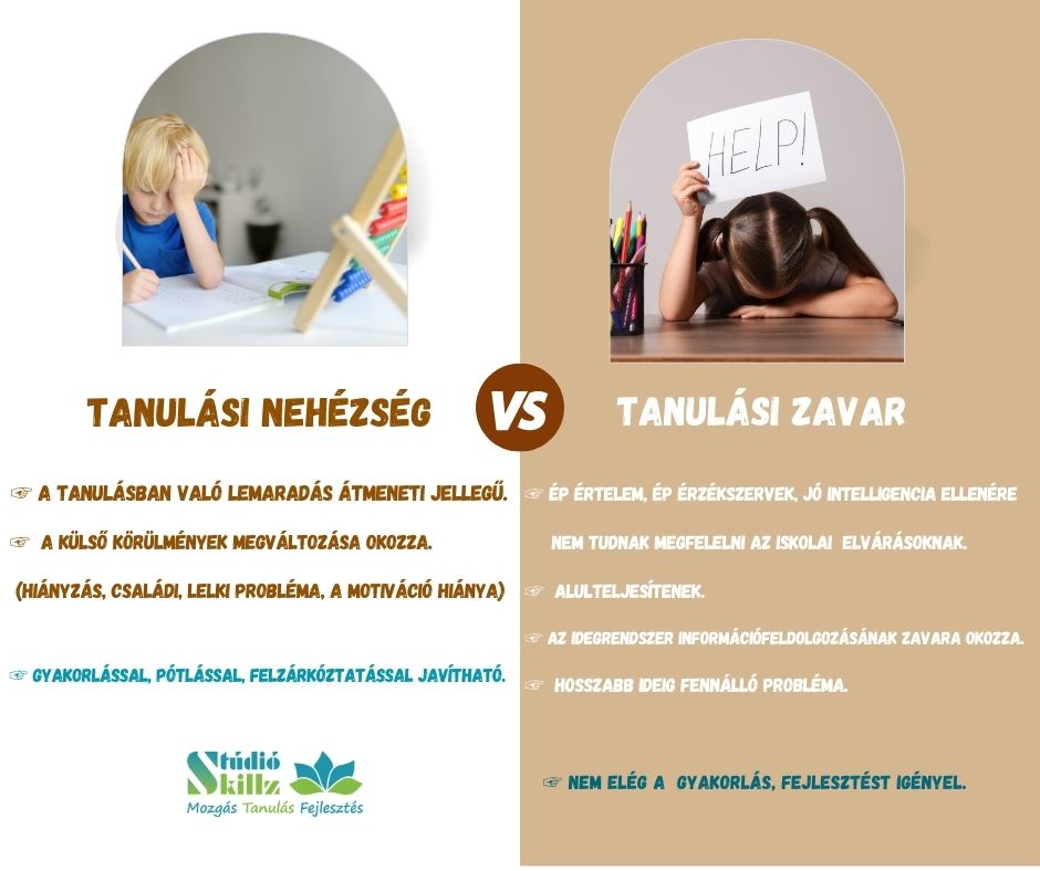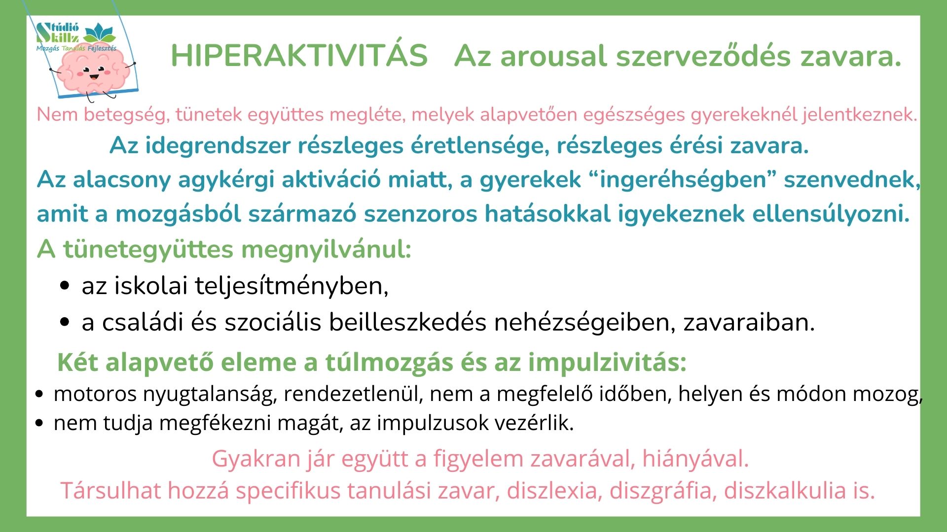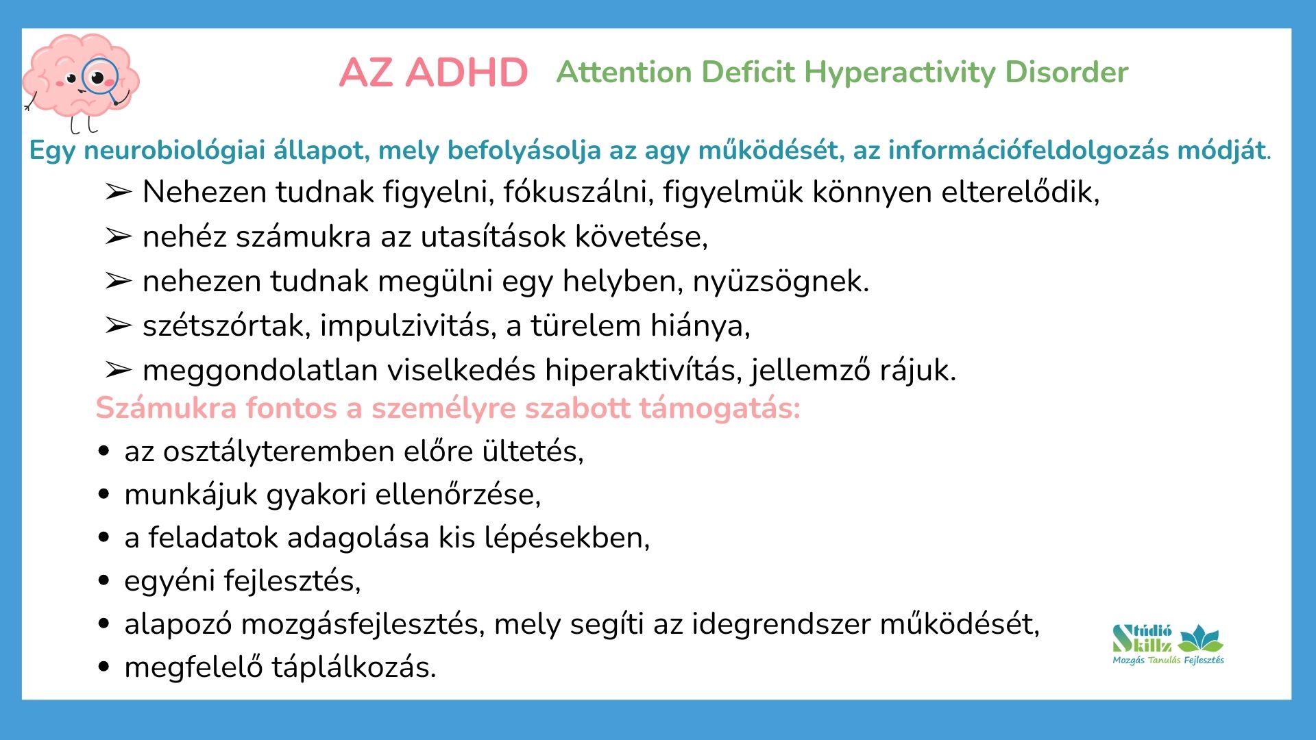 az ADHD különböző formáival, tanulási nehézséggel, tanulási zavarral.